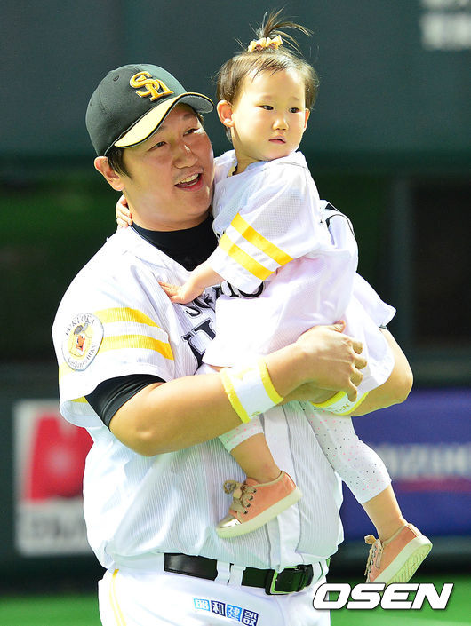 경기 종료 후 수훈 선수로 선정된 이대호가 딸 효린양과 함께 단상으로 향하고 있다./dreamer@osen.co.kr