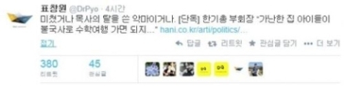 그리고 표창원 전 교수는 23일 자신의 SNS를 통해 "미쳤거나 목사의 탈을 쓴 악마이거나"라는 짧은 글과 함께 한기총 조광작 목사의 세월호 망언 관련 기사를 링크했다.
