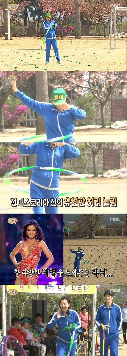 이하늬는 23일 오후 방송된 MBC 예능프로그램 '사남일녀'에서 장구리 체육대회를 진행하던 중 어른들을 위해 훌라후프 시범을 보였다.