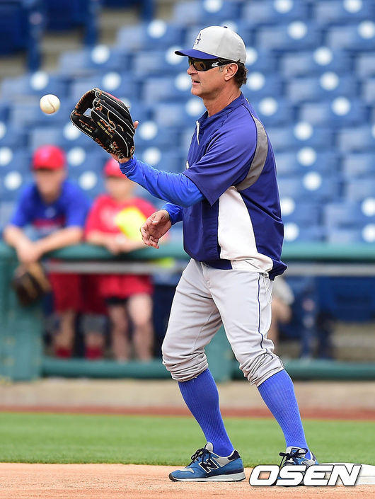 24일(이하 한국시간) 미국 펜실베니아주 필라델피아 시티즌스 뱅크 파크에서 열리는 '2014 메이저리그' 필라델피아 필리스와 LA 다저스의 경기 시작전 돈 매팅리 감독이 1루에서 선수들의 수비 훈련을 돕고 있다.