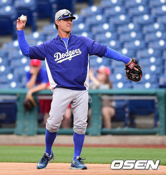 24일(이하 한국시간) 미국 펜실베니아주 필라델피아 시티즌스 뱅크 파크에서 열리는 '2014 메이저리그' 필라델피아 필리스와 LA 다저스의 경기 시작전 돈 매팅리 감독이 1루에서 선수들의 수비 훈련을 돕고 있다.