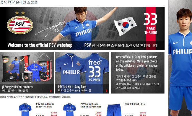 현재 PSV 아인트호벤 공식홈페이지에 접속하면 볼 수 있는 배너광고다. 클릭을 하면 박지성의 사진을 넣은 쿠션, 머그잔, 구단 기념기, 어린이용 유니폼 등 다양한 생활용품을 한 눈에 볼 수 있다. 박지성의 유니폼은 할인된 가격으로 약 80.99유로(한화 약 11만 원)에 살 수 있다. 심지어 약 6000원 짜리 열쇠고리에도 박지성의 얼굴이 들어가 있다.
