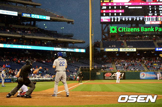 24일(이하 한국시간) 미국 펜실베니아주 필라델피아 시티즌스 뱅크 파크에서 열린 '2014 메이저리그' 필라델피아 필리스와 LA 다저스의 경기 4회초 2사 1,2루 커쇼 타석, 우천으로 경기가 중단되고 있다.