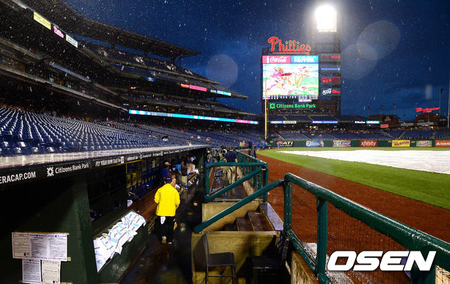 24일(이하 한국시간) 미국 펜실베니아주 필라델피아 시티즌스 뱅크 파크에서 열린 '2014 메이저리그' 필라델피아 필리스와 LA 다저스의 경기 4회초, 우천으로 경기가 중단되고 있다.