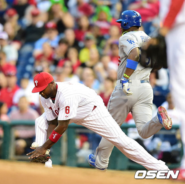 24일(이하 한국시간) 미국 펜실베니아주 필라델피아 시티즌스 뱅크 파크에서 열린 '2014 메이저리그' 필라델피아 필리스와 LA 다저스의 경기 3회초 2사 푸이그가 좌전안타로 1루에서 세이프되고 있다.