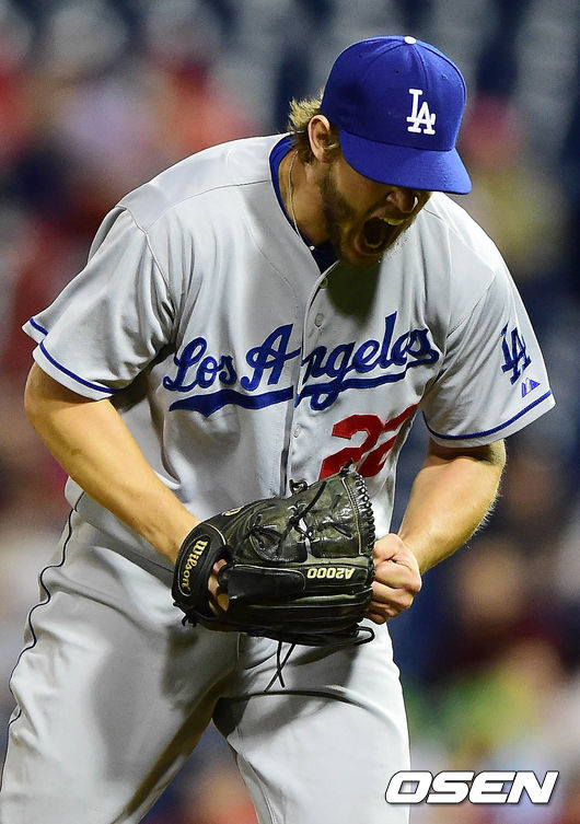 24일(이하 한국시간) 미국 펜실베니아주 필라델피아 시티즌스 뱅크 파크에서 열린 '2014 메이저리그' 필라델피아 필리스와 LA 다저스의 경기 6회말 2사 하워드를 삼진으로 처리한 커쇼가 포효하고 있다.