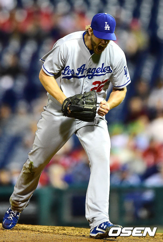 24일(이하 한국시간) 미국 펜실베니아주 필라델피아 시티즌스 뱅크 파크에서 열린 '2014 메이저리그' 필라델피아 필리스와 LA 다저스의 경기 6회말 2사 하워드를 삼진으로 처리한 커쇼가 포효하고 있다.