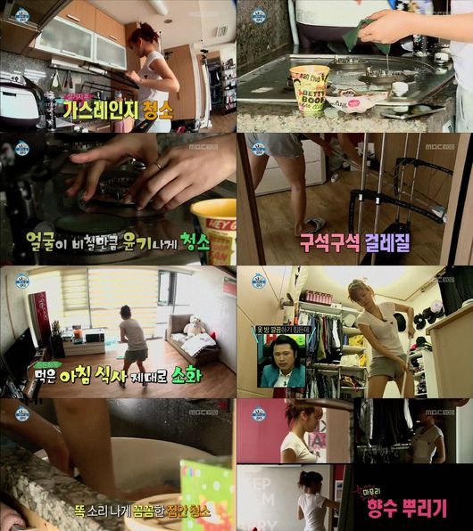 이어 소유는 걸레로 집안 구석구석을 닦았고 옷방까지 깨끗이 청소했다. 이에 노홍철은 “옷방이 저렇게 깔끔하기 힘든데”라며 “똑 소리 난다. 시집가도 되겠네”라고 칭찬했다. 또한 마지막에는 집안 곳곳에 향수를 뿌려 향기롭게 했다.