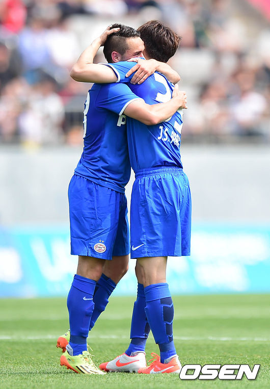 전반 아인트호벤 박지성이 알렉스 샬크의 득점때 함께 환호하고 있다.
