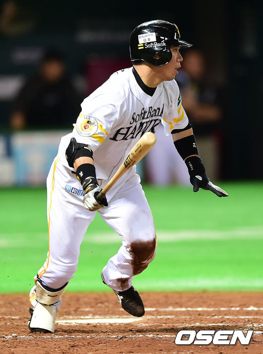 4회말 소프트뱅크 공격 2사 1, 2루 상황 하세가와 유야가 추격의 1타점 중전 안타를 날리고 있다.