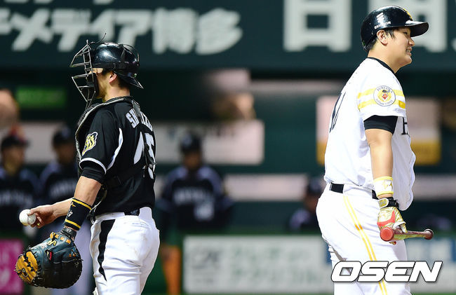 4회말 소프트뱅크 공격 2사 1, 2루 상황 이대호가 한신 선발 노미의 공에 헛스윙 삼진을 당한 뒤 아쉬워하고 있다.