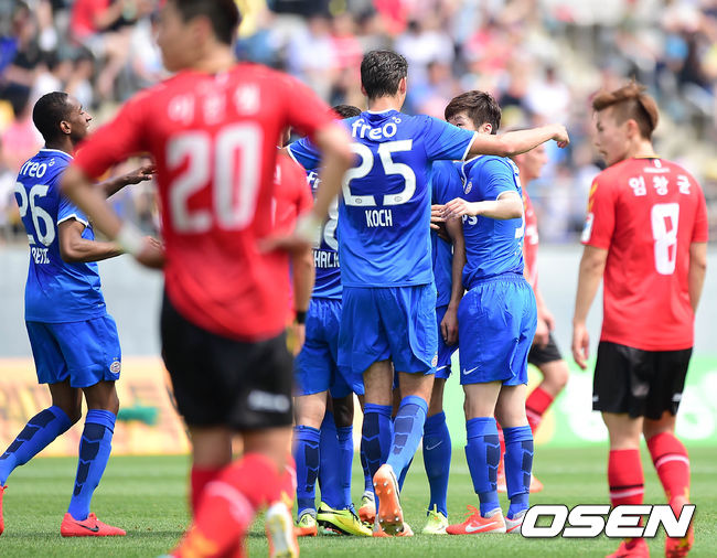 전반 아인트호벤 박지성이 라이 브로엣의 득점때 함께 환호하고 있다.