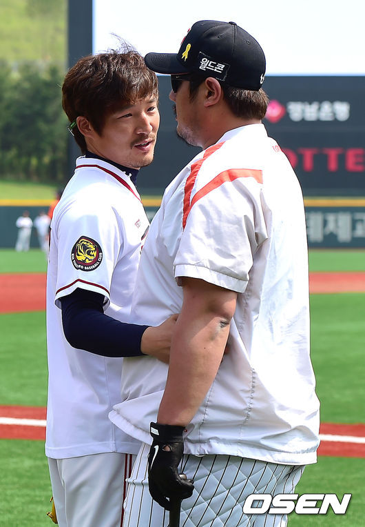 24일 오후 울산 문수야구장에서 열리는 '2014 한국야쿠르트 세븐 프로야구' 롯데 자이언츠와 KIA 타이거즈의 경기에 앞서 KIA 김태영과 롯데 최준석이 이야기를 나누고 있다.