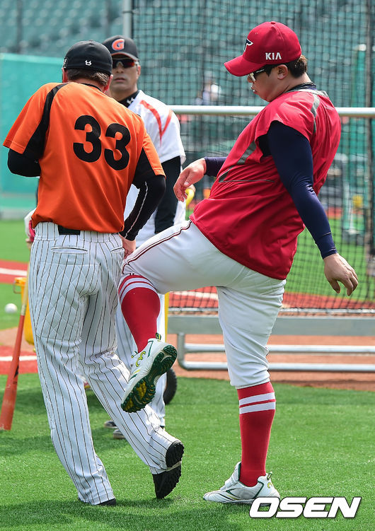24일 오후 울산 문수야구장에서 열리는 '2014 한국야쿠르트 세븐 프로야구' 롯데 자이언츠와 KIA 타이거즈의 경기에 앞서 KIA 나지완이 롯데 공필성 코치와 이야기를 나누던 정훈에게 장난을 치고 있다.
