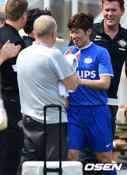 후반 교체되어 나가는 아인트호벤 박지성이 팀관계자의 격려를 받고 있다.