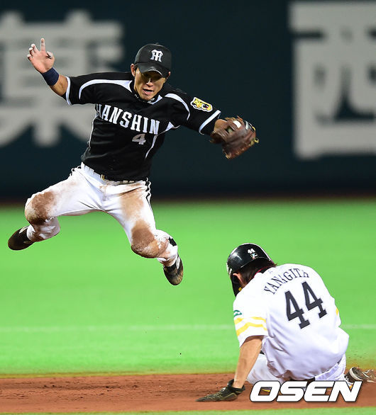 7회말 소프트뱅크 공격 2사 1루 혼다 타석 때 야나기타가 2루 도루에 성공하고 있다.