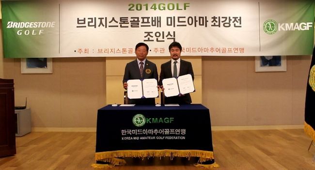 일본 브리지스톤의 골프 용품을 수입하고 있는 (주)석교상사(대표 이민기 www.bsgolf.co.kr)와 한국미드아마추어골프연맹 대표(KMAGF TOUR 대표 이준기)가 지난 23일 경기도 포천에 위치한 몽베르 컨트리 클럽에서 ‘브리지스톤골프배 미드아마 최강전’ 후원 협약을 체결했다.