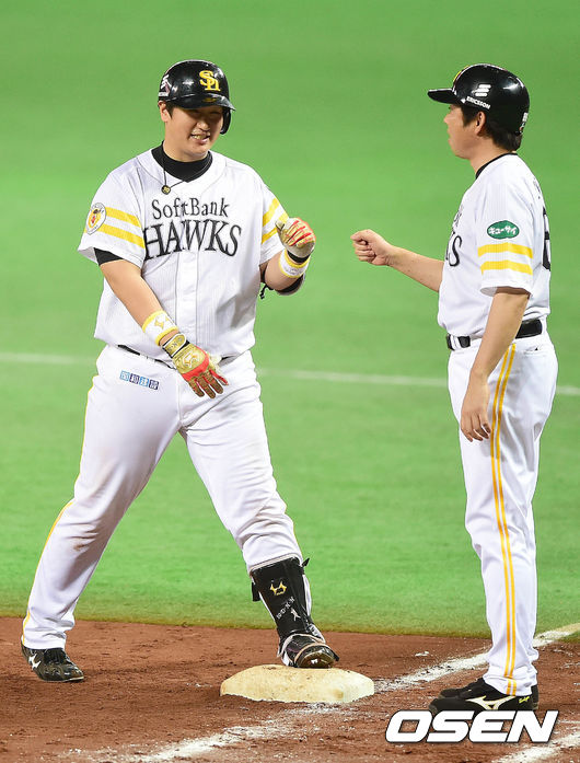 9회말 소프트뱅크 공격 무사 1루 상황 한신 마무리투수 오승환을 상대로 좌전안타를 날린 이대호가 1루에 안착해 미소짓고 있다./dreamer@osen.co.kr