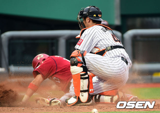 5회초 2사 1,2루 롯데 강민호가 KIA 이대형의 좌전 안타때 홈으로 쇄도하던 차일목을 아웃시키고 있다.