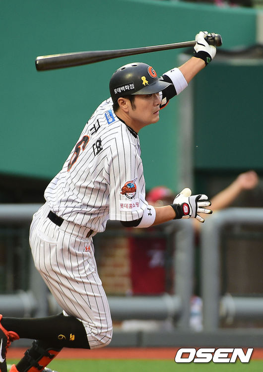 5회말 1사 1,3루 롯데 문규현이 1타점 적시타를 때리고 있다.