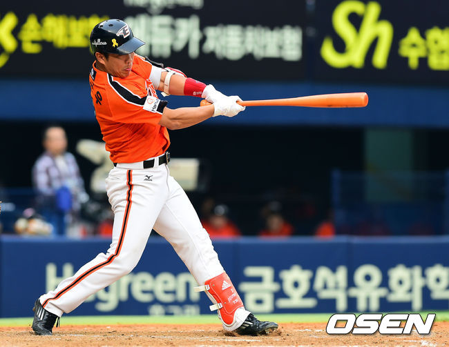 24일 오후 서울 잠실구장에서 열린 2014 한국야쿠르트 세븐 프로야구 두산 베어스와 한화 이글스의 경기, 5회초 2사 2,3루 정근우가 2타점 적시타를 날리고 있다.