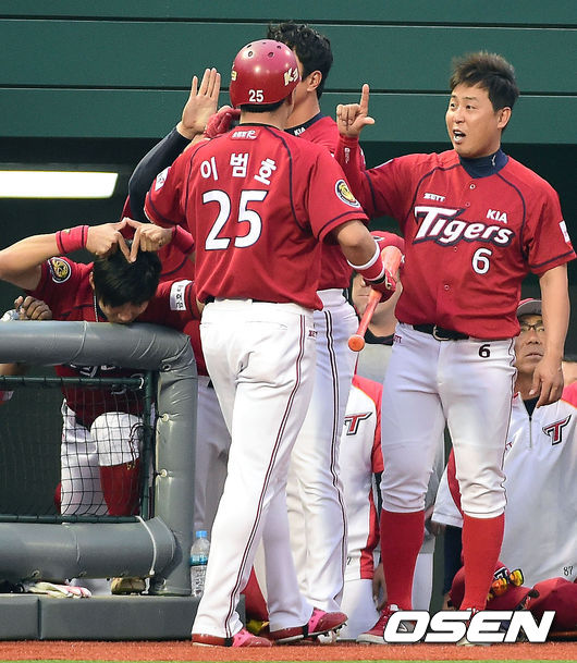 6회초 2사 1루 KIA 이범호가 좌측 담장을 넘기는 투런 홈런을 때린 뒤 동료들과 기뻐하고 있다.