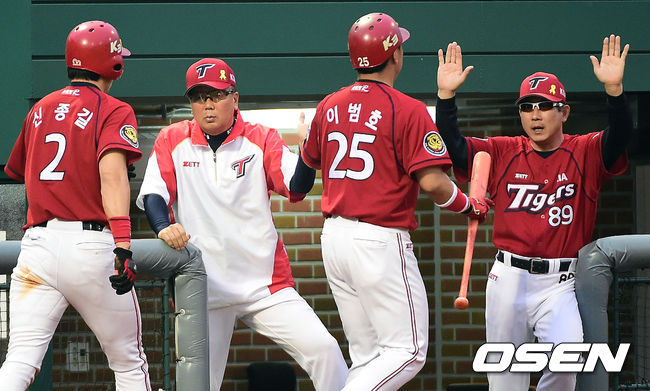 6회초 2사 1루 KIA 이범호가 좌측 담장을 넘기는 투런 홈런을 때린 뒤 선동열 감독, 한대화 코치와 기뻐하고 있다.