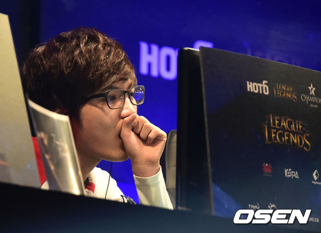 롤챔스 결승전 1세트를 내준 나진 실드 조재걸이 아쉬워 하고 있다. /spjj@osen.co.kr