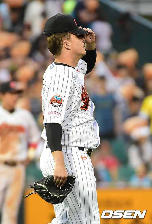 6회초 2사 1루 롯데 옥스프링이 KIA 이범호에게 투런 홈런을 허용한 뒤 아쉬워하고 있다.