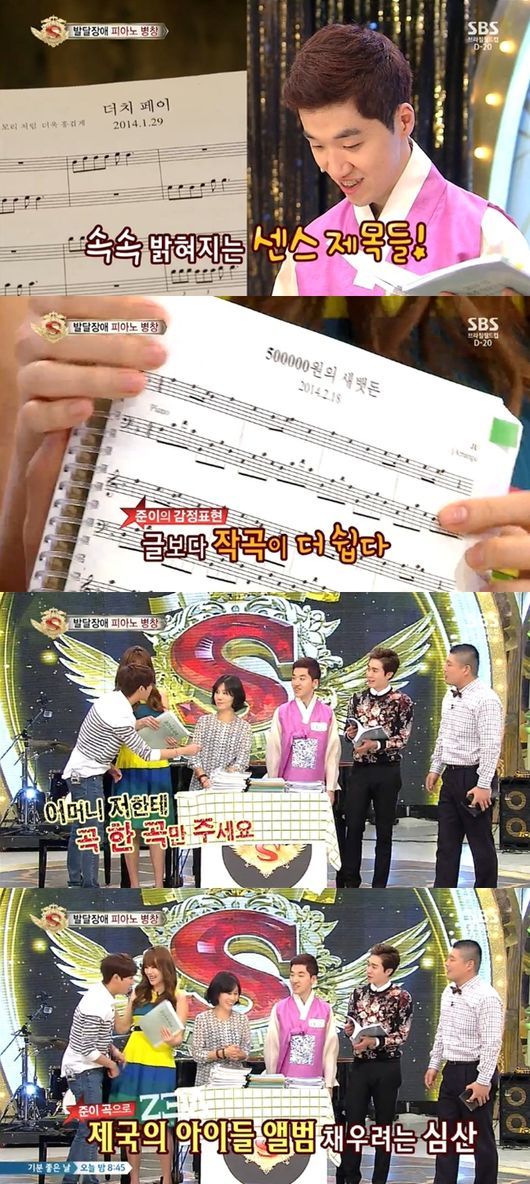 24일 오후 방송된 SBS 예능프로그램 ‘놀라운 대회 스타킹’에는 자폐성 발달장애가 있지만 음악적 재능은 탁월한 ‘피아노 병창’ 천재 최준 씨가 출연했다.