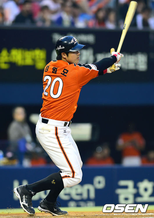 24일 오후 서울 잠실구장에서 열린 2014 한국야쿠르트 세븐 프로야구 두산 베어스와 한화 이글스의 경기, 7회초 무사 2루 정범모가 1타점 적시타를 날리고 있다.
