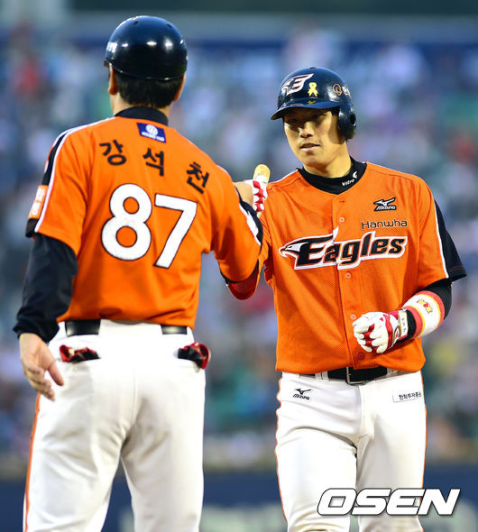 24일 오후 서울 잠실구장에서 열린 2014 한국야쿠르트 세븐 프로야구 두산 베어스와 한화 이글스의 경기, 7회초 무사 2루 1타점 적시타를 날린 정범모가 1루에서 강석천 코치와 하이파이브를 나누고 있다.