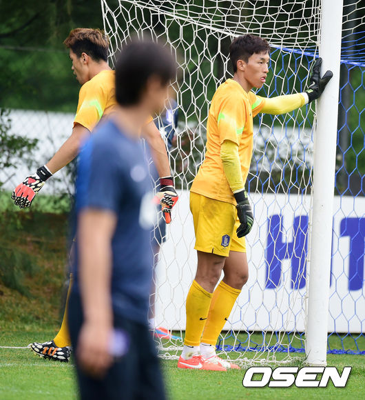 정성룡, 김승규가 홍명보 감독이 지켜보는 가운데 훈련을 하고 있다.