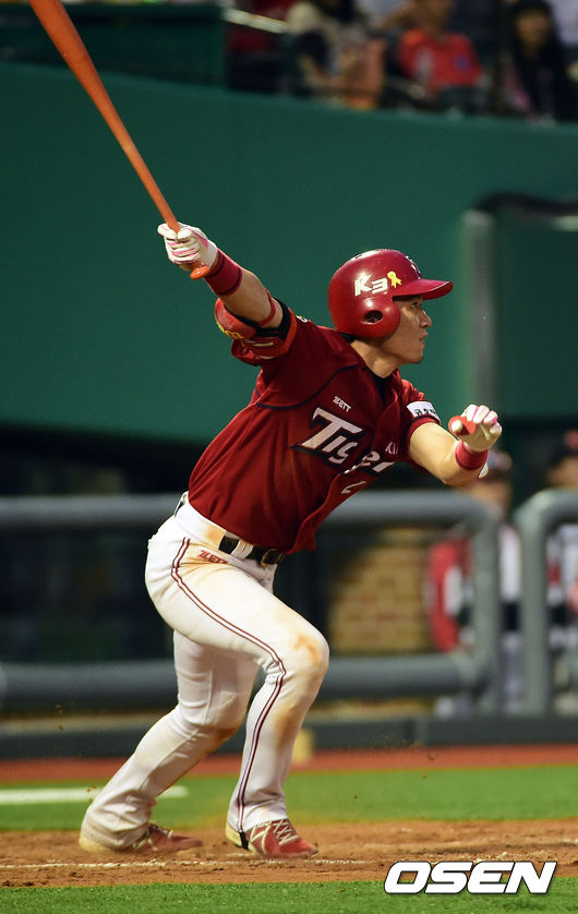 7회초 2사 3루 KIA 신종길이 1타점 적시 2루타를 때리고 있다.