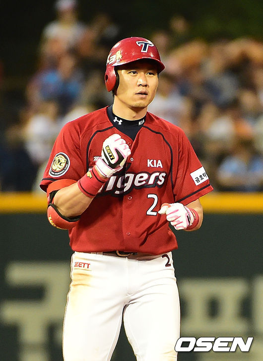 7회초 2사 3루 KIA 신종길이 1타점 적시 2루타를 때린 뒤 기뻐하고 있다.