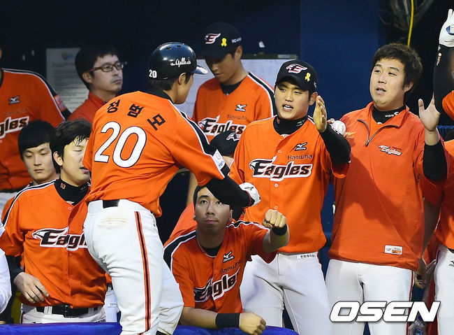 24일 오후 서울 잠실구장에서 열린 2014 한국야쿠르트 세븐 프로야구 두산 베어스와 한화 이글스의 경기, 7회초 무사 1루 이용규의 1타점 2루타로 홈을 밟은 1루주자 정범모가 덕아웃에서 동료들로부터 환영을 받고 있다.