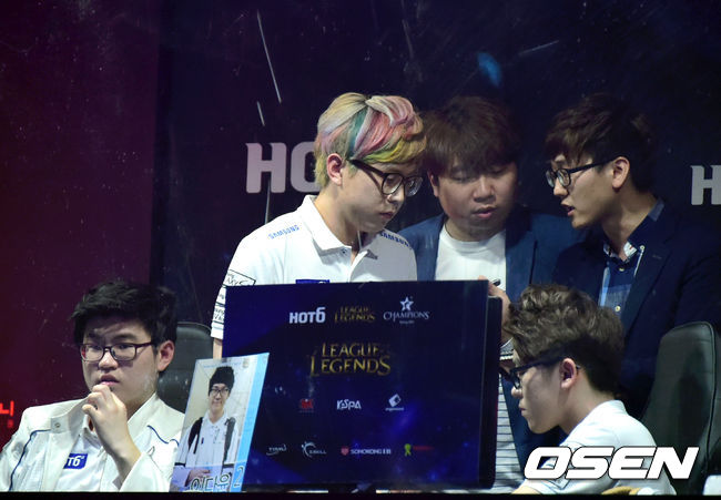 롤챔스 결승전 2세트서 패한 삼성 블루 선수들이 작전회의를 하고 있다. /spjj@osen.co.kr