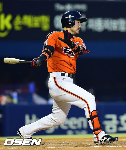 24일 오후 서울 잠실구장에서 열린 2014 한국야쿠르트 세븐 프로야구 두산 베어스와 한화 이글스의 경기, 7회초 1사 2,3루 한상훈이 2타점 적시타를 날리고 있다.