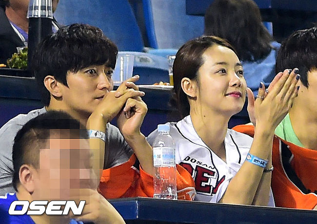 24일 오후 서울 잠실구장에서 열린 2014 한국야쿠르트 세븐 프로야구 두산 베어스와 한화 이글스의 경기, 소이현과 인교진 커플이 야구관람을 하고 있다.
