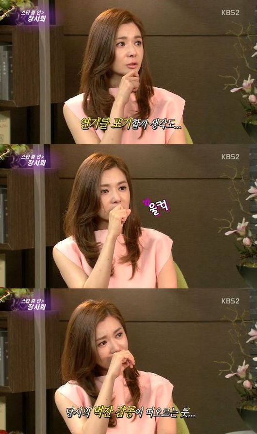 이날 장서희는 자신이 아역 연기자 시절부터 활동한 영상을 보며 눈물을 보였다. 특히 대상을 받았을 당시를 보고 "당시를 생각하면 아직도 눈물이 난다"고 말했다.