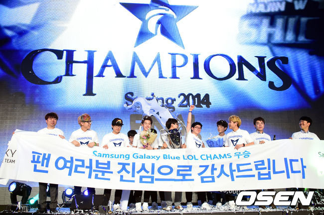 삼성 블루는 24일 경기도 고양시 일산 킨텍스 9홀에서 열린 '핫식스 LOL 챔피언스(이하 롤챔스)' 스프링 2014시즌 나진 실드와 결승전서 '다데' 배어진이 집중 견제 당하는 가운데에서 제 몫을 다하고 '스피릿' 이다윤의 녹턴 카드가 기막히게 통하면서 3-1 승리를 거뒀다. 삼성 블루가 롤챔스 첫 우승을 차지하는 순간이었다.