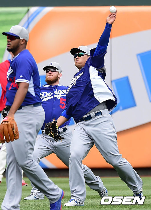 25일(이하 한국시간) 미국 펜실베니아주 필라델피아 시티즌스 뱅크 파크에서 열리는 '2014 메이저리그' 필라델피아 필리스와 LA 다저스의 경기 시작전 류현진이 외야에서 롱토스를 하고 있다.