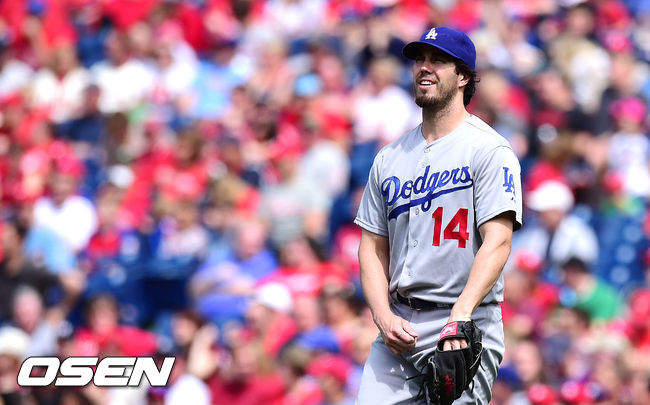25일(이하 한국시간) 미국 펜실베니아주 필라델피아 시티즌스 뱅크 파크에서 열린 '2014 메이저리그' 필라델피아 필리스와 LA 다저스의 경기 1회말 선두타자 벤 르비어에게 2루타를 허용한 댄 하렌이 미소를 짓고 있다.