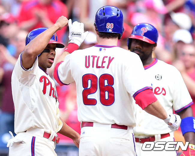 25일(이하 한국시간) 미국 펜실베니아주 필라델피아 시티즌스 뱅크 파크에서 열린 '2014 메이저리그' 필라델피아 필리스와 LA 다저스의 경기 1회말 1사 2루 체이스 어틀리가 투런포를 치고 홈에서 2루주자 벤 르비어와 하이파이브를 하고 있다.