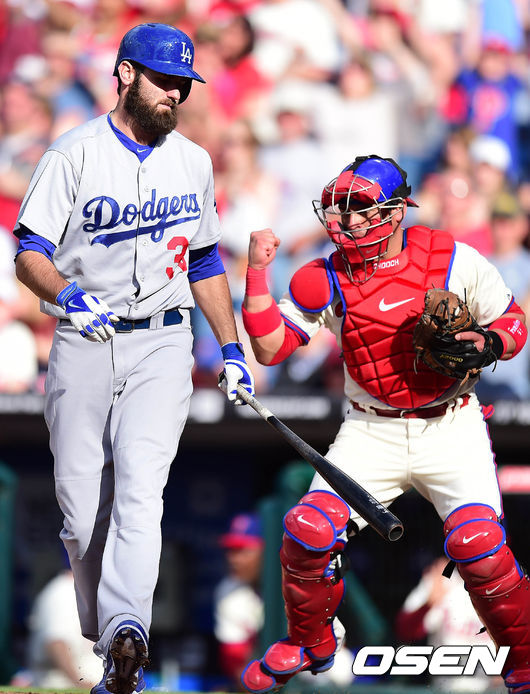 25일(이하 한국시간) 미국 펜실베니아주 필라델피아 시티즌스 뱅크 파크에서 열린 '2014 메이저리그' 필라델피아 필리스와 LA 다저스의 경기 9회초 2사 1,2루 대타 밴 슬라이크가 삼진을 당하고 있다.