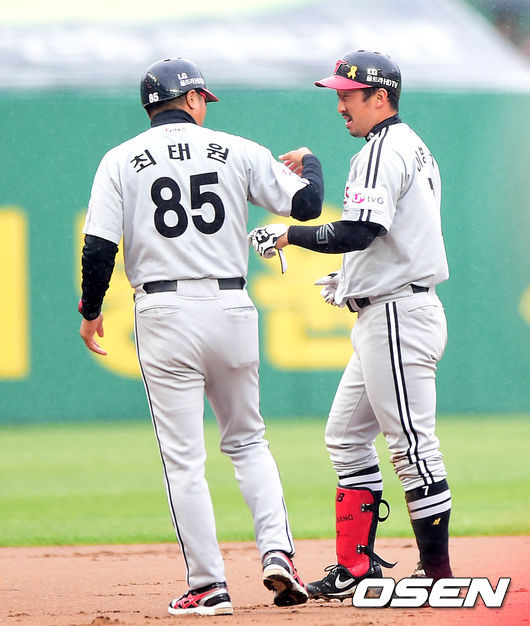 1회초 2사 만루에서 LG 이병규가 우전 3타점 적시 2루타를 치고 3루로 쇄도하다 태그아웃 처리되며 더그아웃으로 가고 있다.