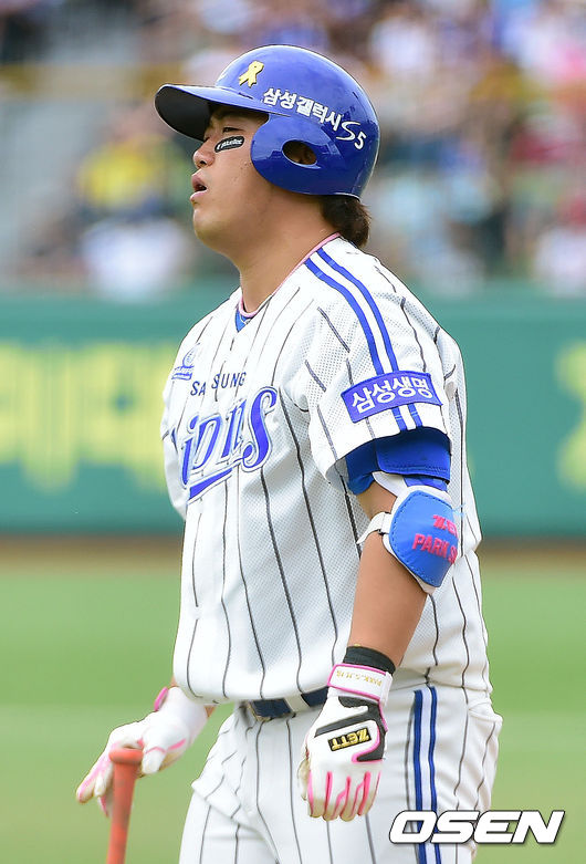 1회말 1사 1,2루 삼성 박석민이 헛스윙을 한 뒤 어깨통증을 호소하고 있다.