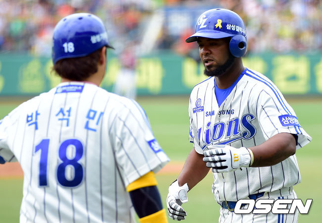 1회말 무사 만루 삼성 나바로가 최형우의 희생플라이로 득점을 올린 뒤 박석민과 하이파이브를 하고 있다.