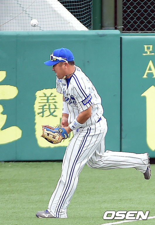 3회초 1사 삼성 최형우가 넥센 허도환의 타구를 잡았다 놓치고 있다. 그 사이 넥센 허도환은 2루까지 진루했다.