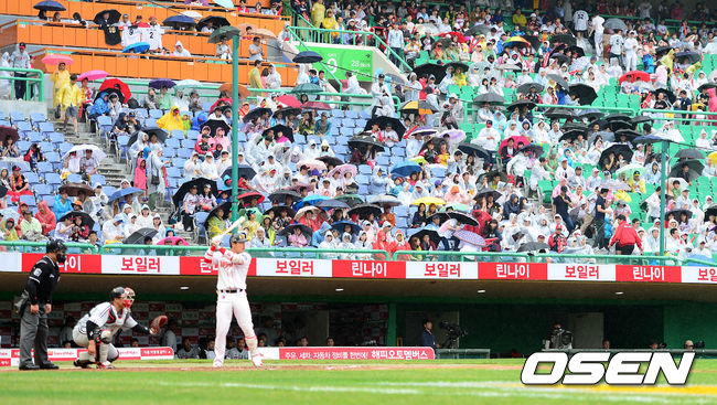비가 내리는 가운데 야구팬들이 우산을 펴고 열띤 응원을 펼치고 있다.